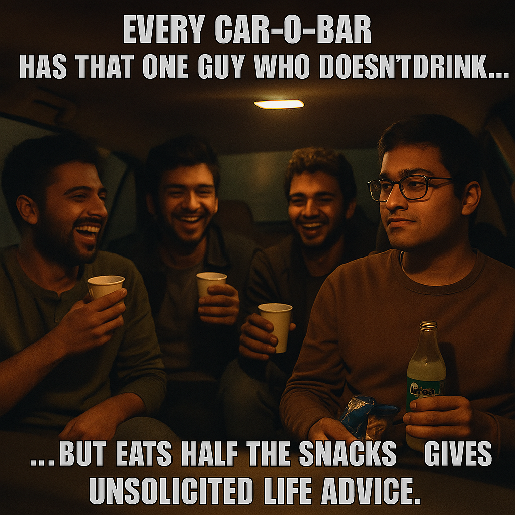 Ah, Delhi. The only city where your social life can peak in the front seat of a Honda City, parked under a flyover with four dudes, three disposable glasses, and one bottle of Old Monk lovingly wrapped in newspaper.