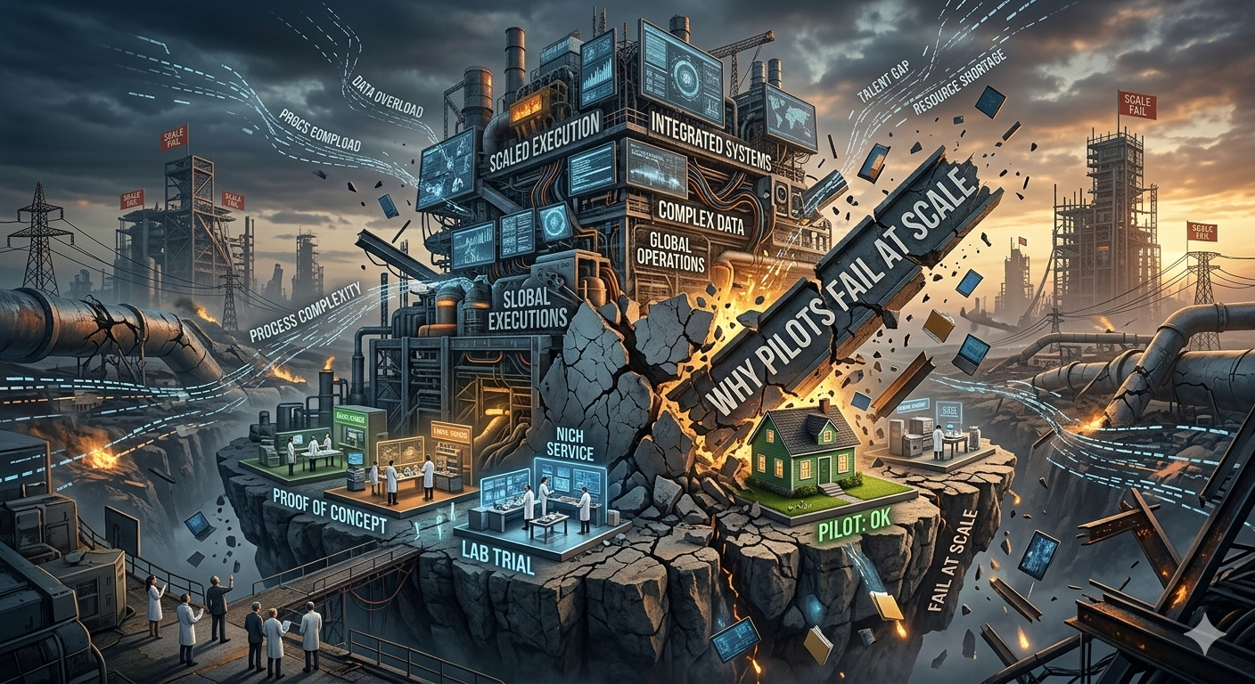 Pilots are exciting – they prove you can do something new. Scaling is where you prove you will do it reliably, everywhere, every day. The gap between pilot success and enterprise impact is often bigger than we expect and that’s where most failures happen.