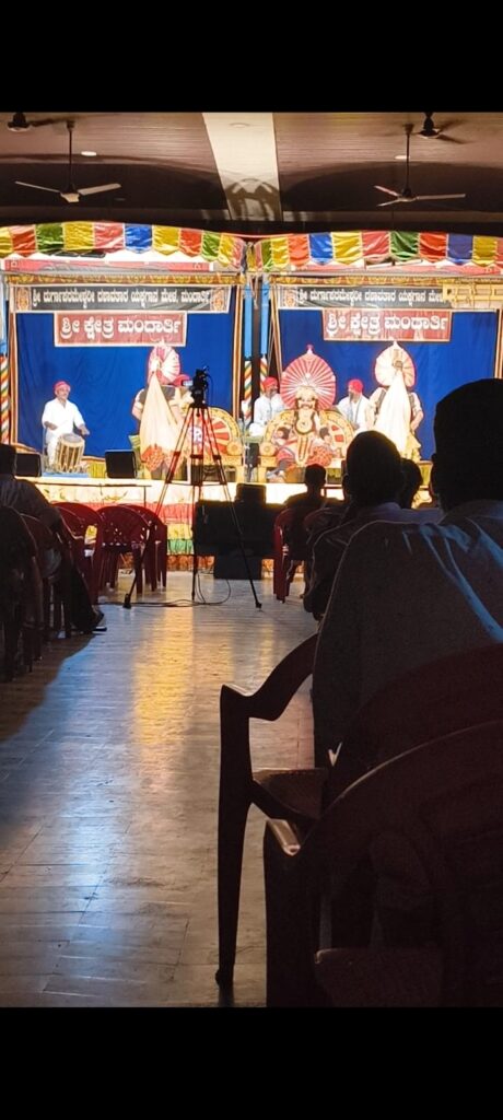 On the way back, something unexpected caught our eye…a Yakshagana performance in Mandarthi, the kind that fills the night air with music and myth. We stopped to watch for a few minutes, and for a brief moment, it felt like living inside Kantara.
